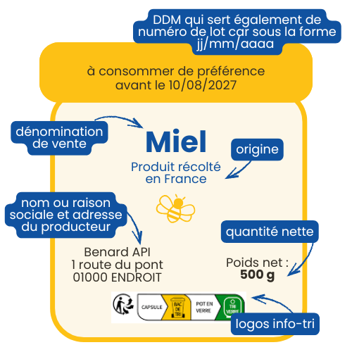 Qu’il s’agisse de miel, de pollen ou de gelée royale, le metteur en marché est responsable du contenu de l’étiquette : elle doit être claire, lisible, et conforme à la réglementation européenne et française.